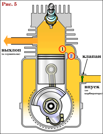 Когда поршень дойдет до выпускного окна (1 на рис. 4), оно открывается и начнется выпуск отработавших газов в атмосферу, давление в цилиндре понижается. При дальнейшем перемещении поршень открывает продувочное окно (1 на рис. 5) и сжатая в кривошипной камере горючая смесь поступает по каналу (2 на рис. 5), заполняя цилиндр и осуществляя продувку его от остатков отработавших газов.См.рис.5