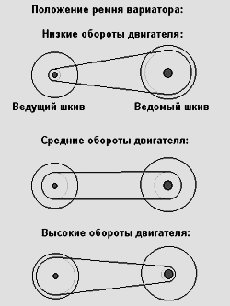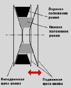 Шкивы вариатора, в отличие от обычной клиноременной передачи имеют особенность: расстояние между щеками может изменяться. На ведущем шкиве этим занимается муфта вариатора, описанию которой посвящена данная статья. Щеки ведомого шкива просто сжимаются пружиной. При увеличении оборотов двигателя муфта вариатора сводит щеки ведущего шкива, при этом ремень выжимается от положения, близкого к центру шкива на его периферию. Поскольку длина ремня постоянна, то при этом его натяжение увеличивается и на ведомом шкиве он, преодолевая сопротивление пружины, раздвигает его щеки, смещаясь к центру шкива. Передаточное число вариатора - это отношение радиусов, по которым проходит ремень на ведомом и на ведущем шкивах. Увеличение оборотов двигателя вызывает уменьшение передаточного числа, что эквивалентно включению более высоких передач в обычной коробке.