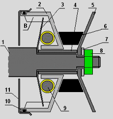 Самая сложная деталь в вариаторе - это муфта, которая управляет положением щек ведущего шкива. От ее исправности зависит разгонная динамика скутера. Корпус муфты 2 является одновременно подвижной щекой шкива. На хвостовике коленвала 1 закреплены: упорный диск 3, распорная втулка 4, неподвижная щека шкива 5. Крепление осуществляется затяжкой гайки 8 через шайбу 7. Корпус муфты может продольно перемещаться относительно вала. Для предотвращения его проворачивания относительно неподвижной щеки служат выступы (В) на внутренней поверхности, которые входят в прорези на упорном диске 3. Между упорным диском и внутренней конусной поверхностью подвижной щеки расположены шесть роликов 9. Ролики могут перемещаться по радиальным каналам, сделанным в корпусе муфты 2 (на рисунке не показаны). Ролик имеет цилиндрическую форму и состоит из металлического сердечника, помещенного в пластмассовую втулку. Ролики смазываются густой смазкой, залитой в корпус муфты. Чтобы смазка не вытекала и не попадала на ремень, муфта закрыта металлической крышкой 11 через резиновую прокладку 10. (Кстати, именно наличие этой смазки, стекающей на стоянке в нижнюю часть муфты, вызывает повышенную вибрацию двигателя сразу после его пуска. После равномерного распределения смазки вибрация прекращается.)